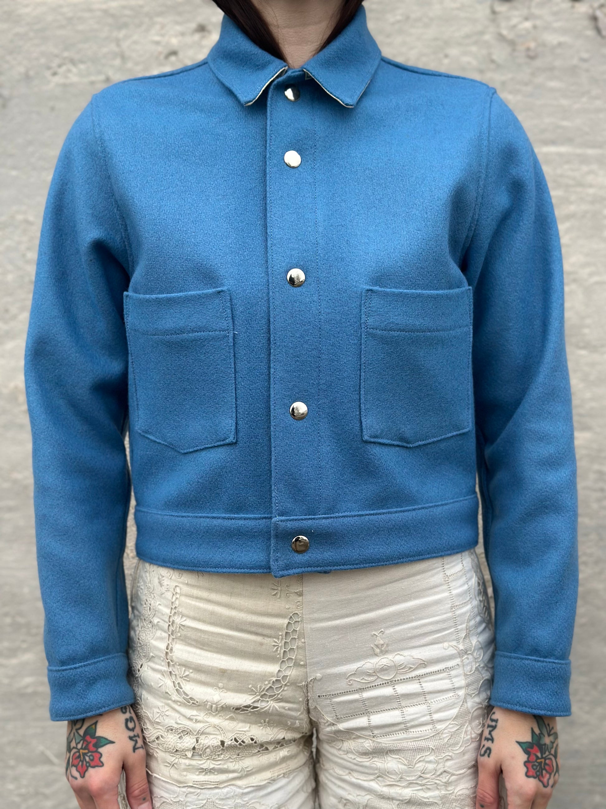 The wool jacket in the perfect blue. A classic silhouette that can be worn everyday. Made from 100% boiled wool that is soft, warm, and wind resistant. This jacket has silver snap buttons and two front pockets.