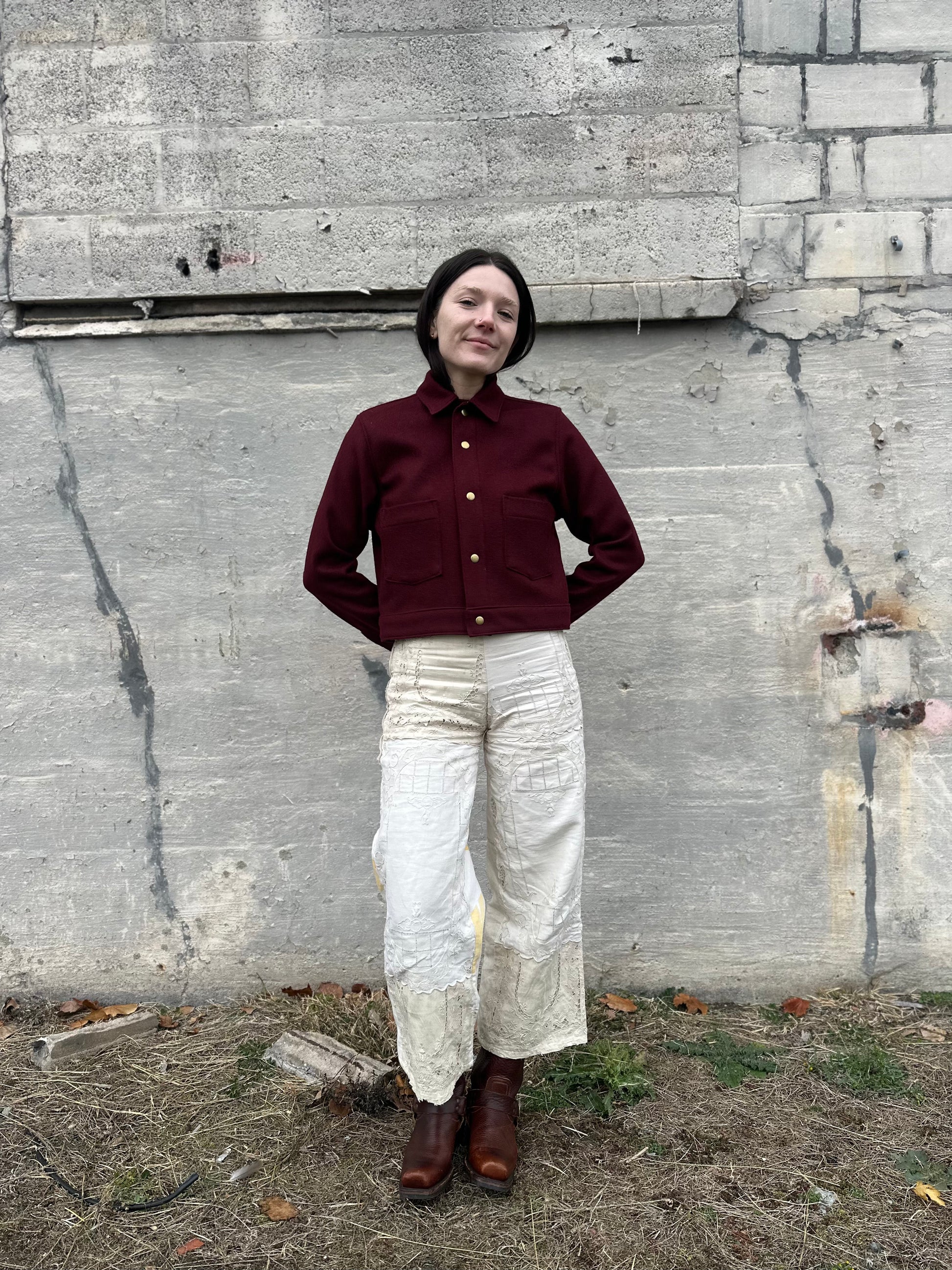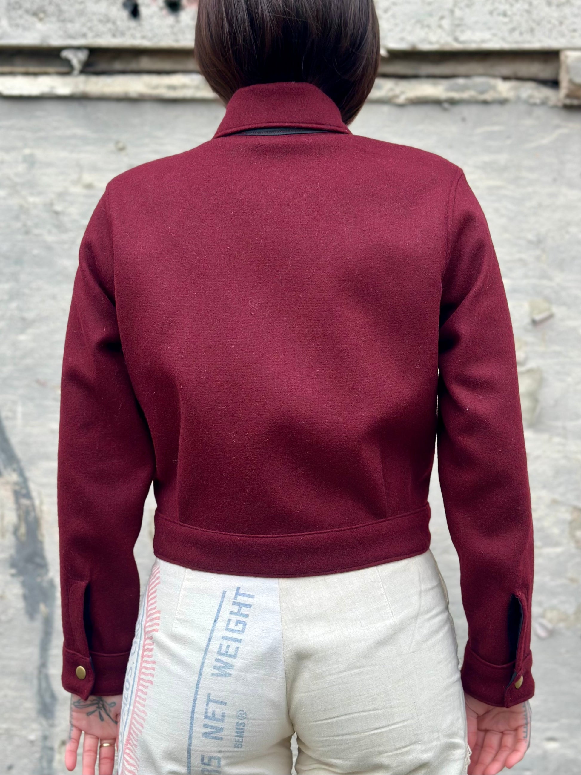 The wool jacket in oxblood has a classic silhouette that can be dressed up or worn everyday. Made from 100% boiled wool that will keep you warm and dry all winter. This jacket has two front pockets and brass snap button details.