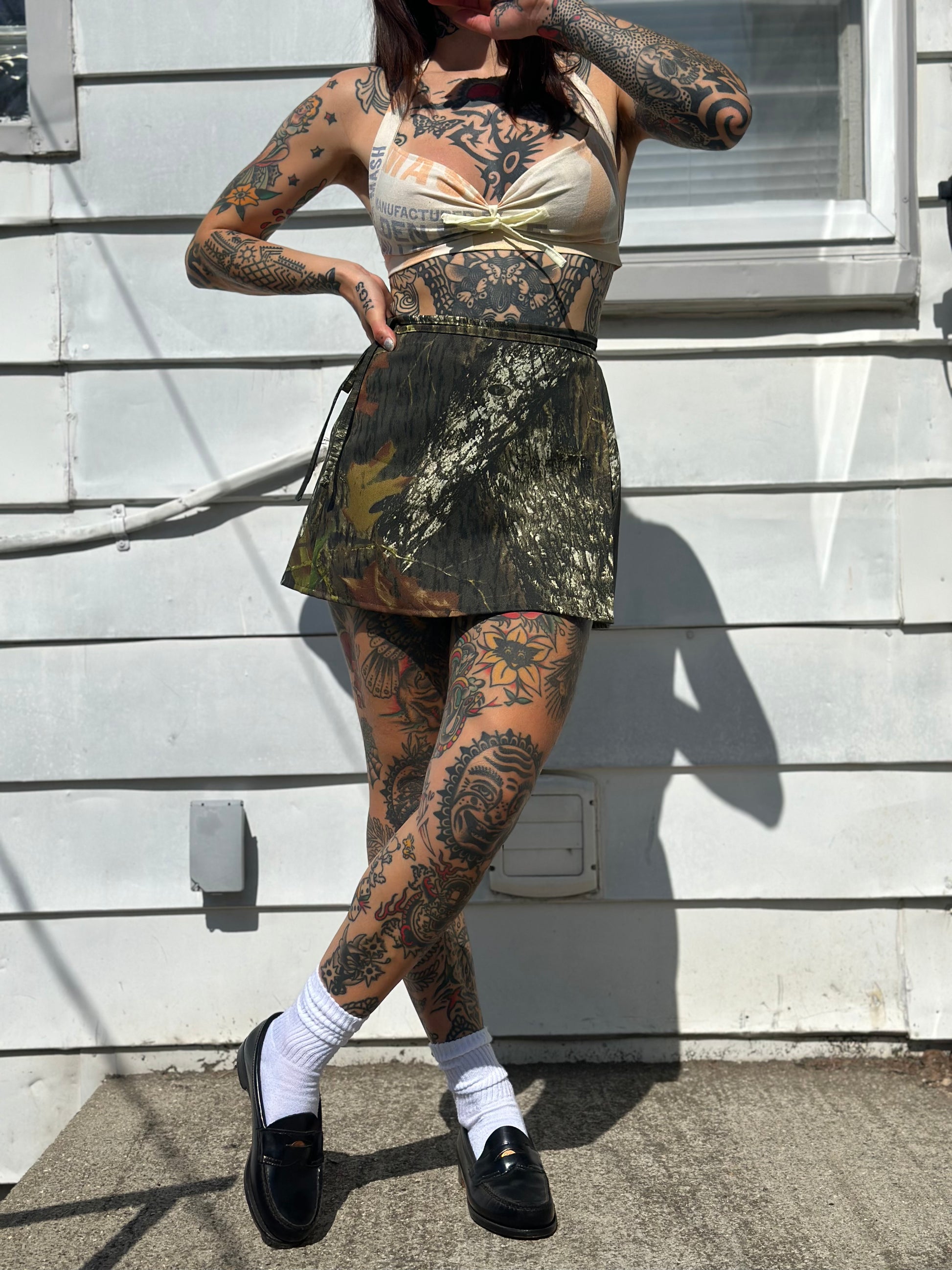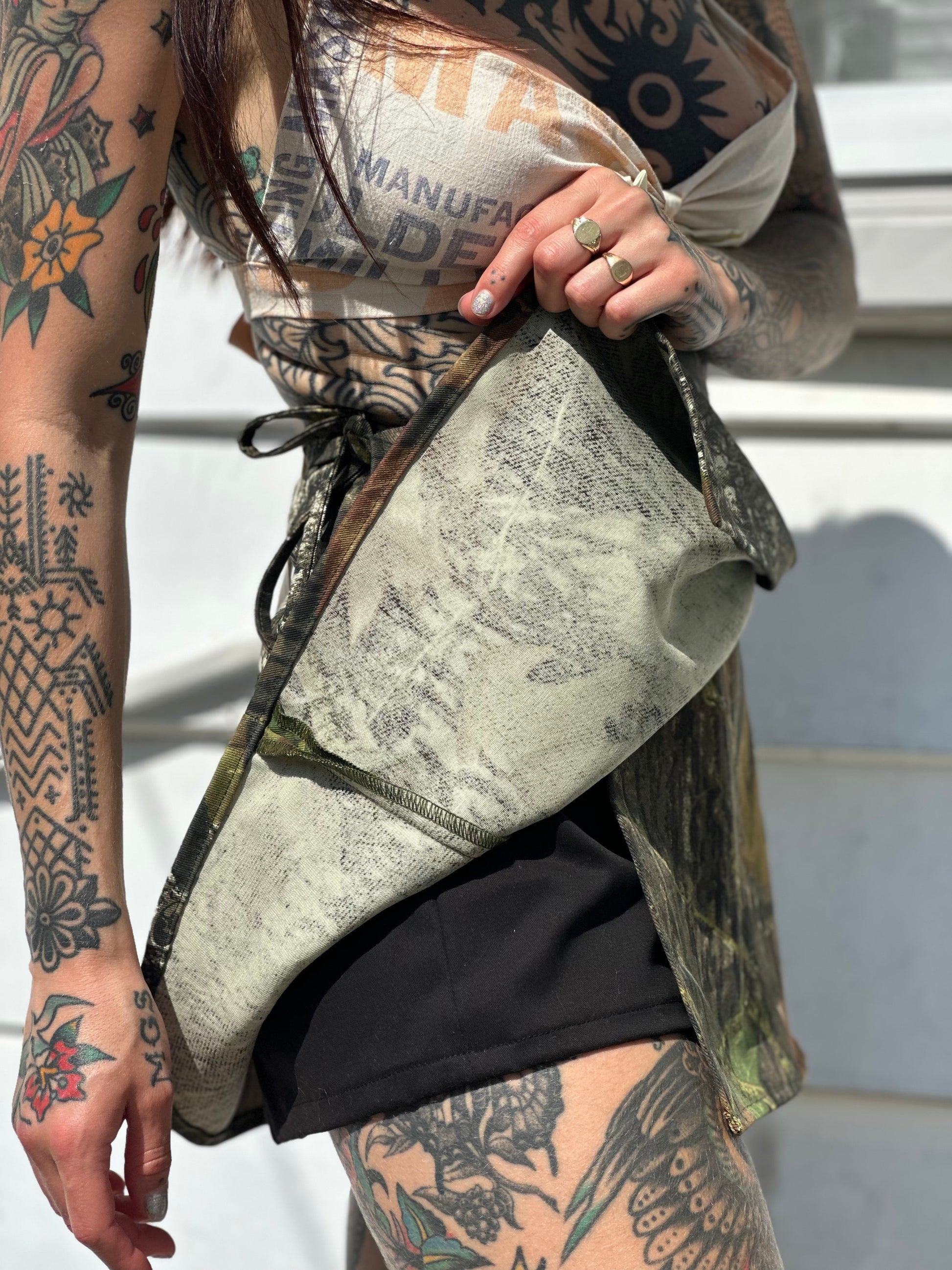 The real tree skort is a high-waisted mini skirt with built-in shorts and a wrap-tie closure, making the design versatile. Real tree material is a structured twill, and the shorts are made from a stretch twill, which allows for ease and comfort. Garments are handmade in Michigan.