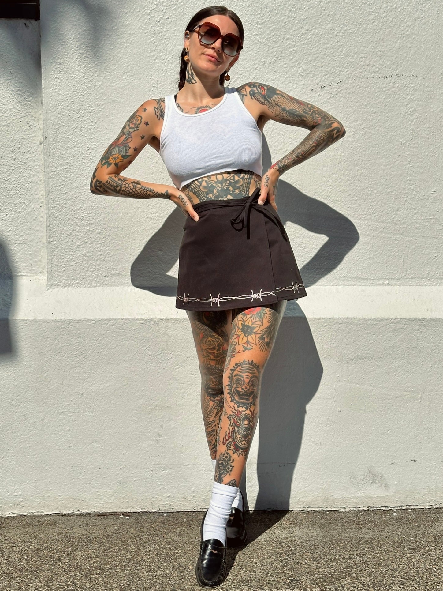 A special collaboration by Chain and Sun Love. Our one-of-a-kind chainstitch black skorts are high-waisted with a built-in short and wrap-tie closure. Chainstitch embroidery done by Chain. Skorts designed and sewn by Sun Love.