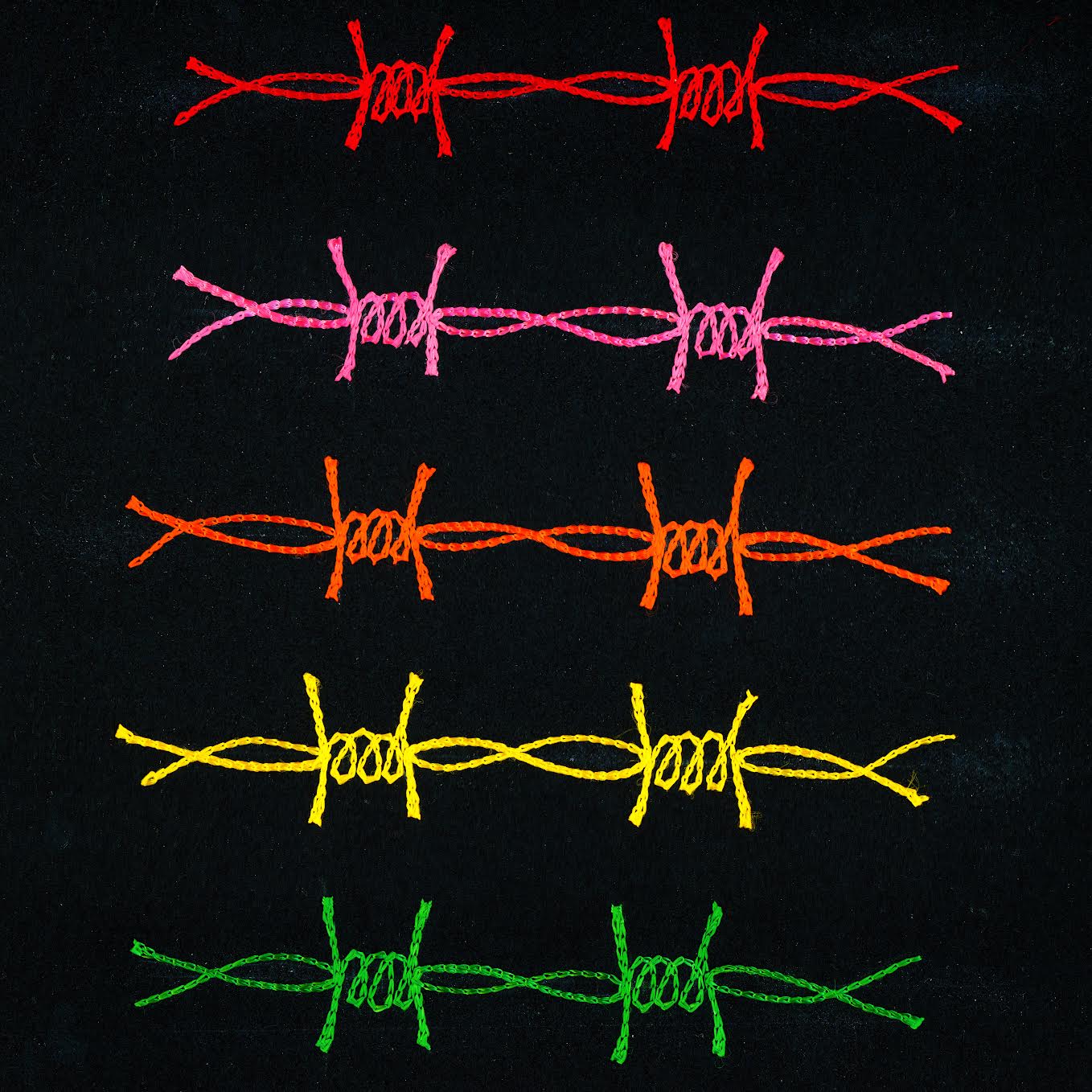 The thread colors pictured are orange, red, and hot pink. Model is wearing a size XS.