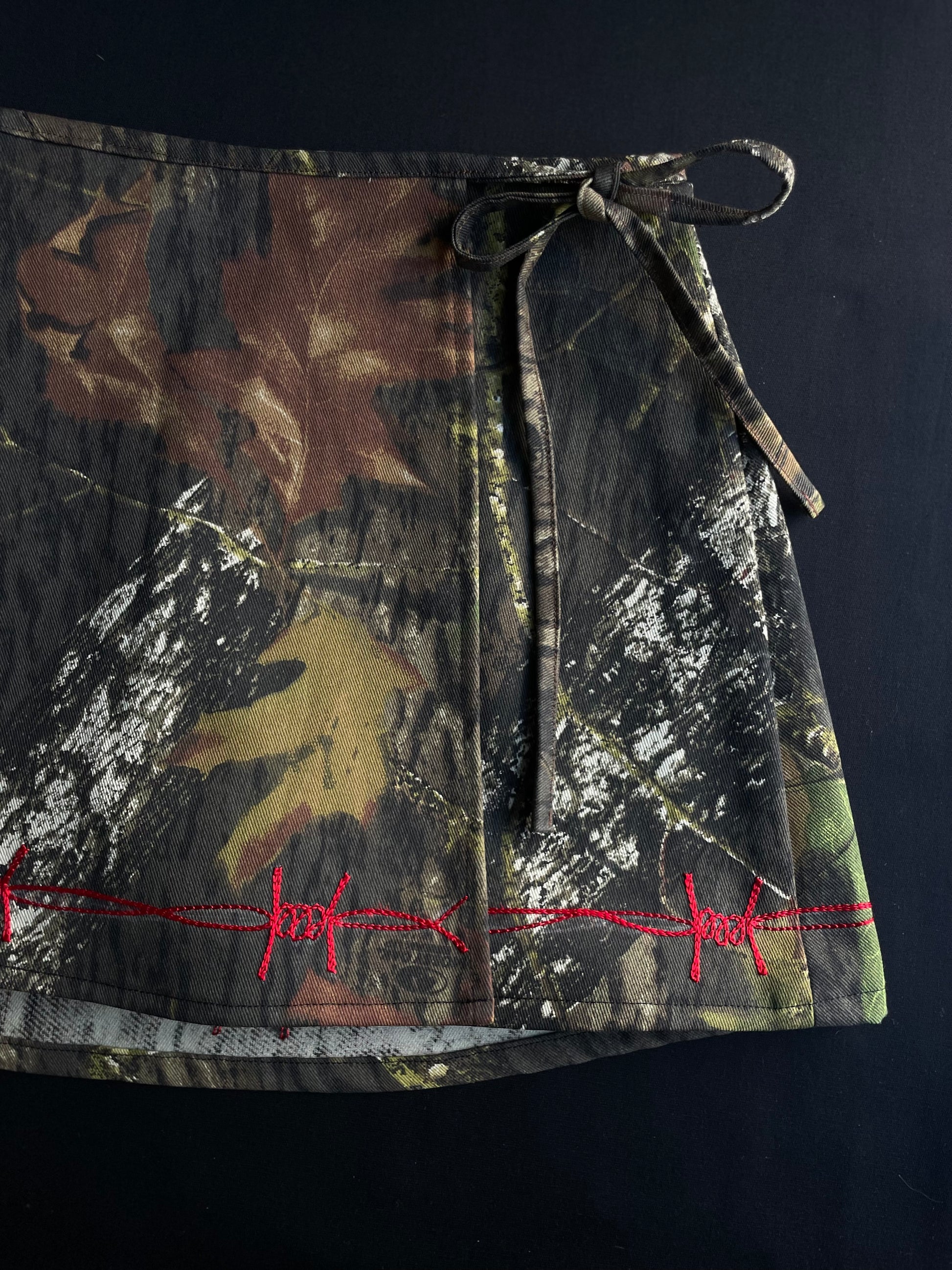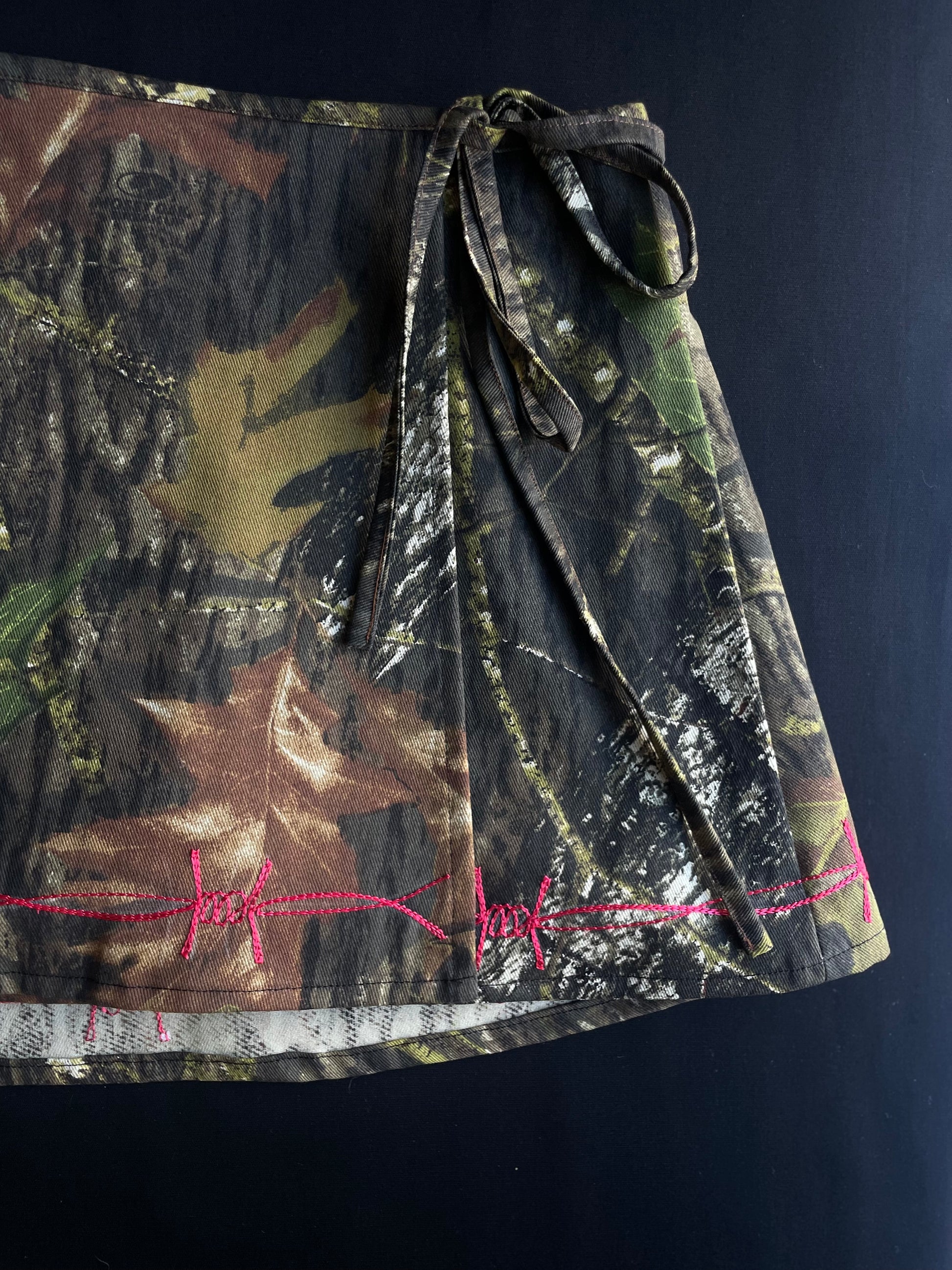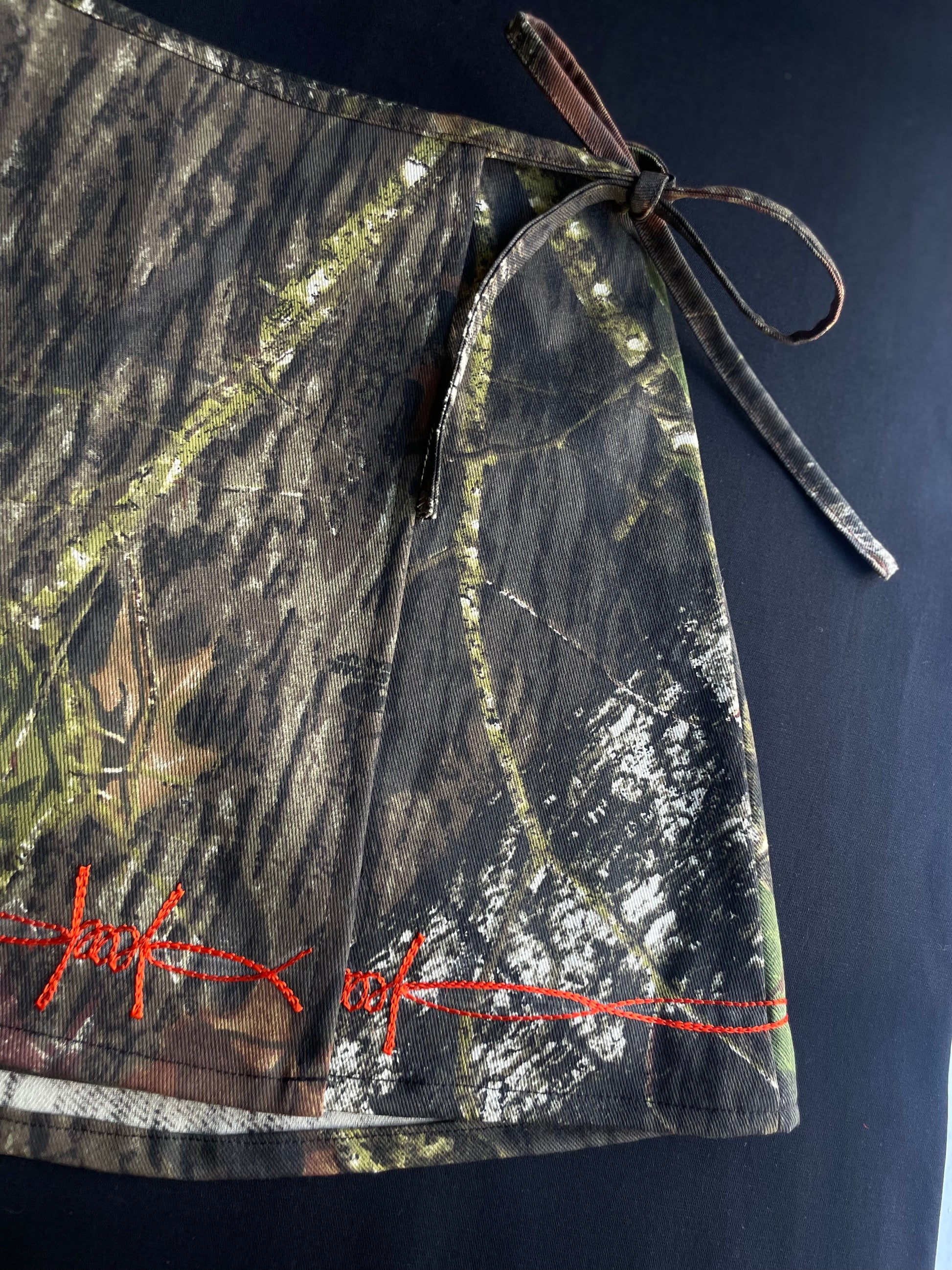 A special collaboration by Chain and Sun Love. Our one-of-a-kind chainstitch real tree skorts are high-waisted with a built-in short and wrap-tie closure. Chainstitch embroidery done by Chain. Skorts designed and sewn by Sun Love.