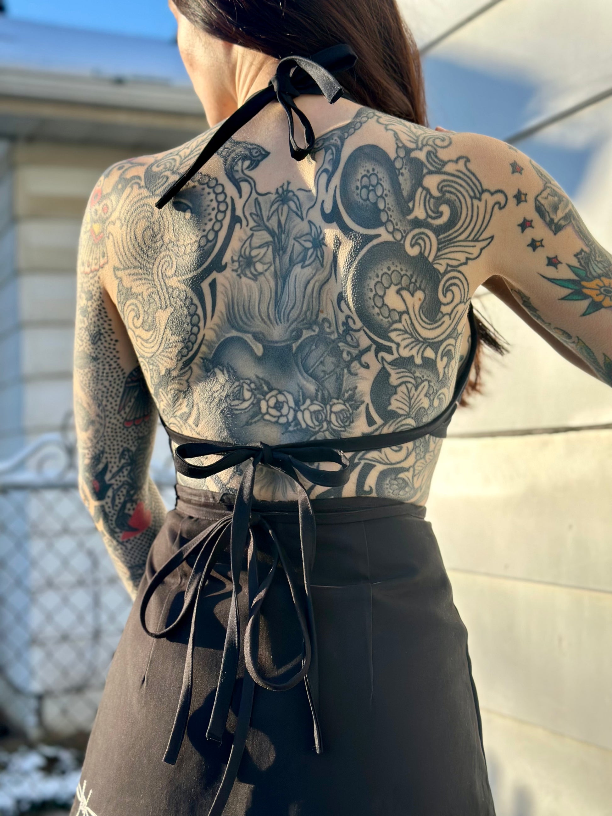 A special collaboration by Chain and Sun Love. Our one-of-a-kind chainstitch tie tops in black are a simple open-back halter style that ties at the neck and chest. Made from stretch twill that is soft and flexible. Wear with your favorite bottoms or match with our Chain X Sun Love Skort. Chainstitch embroidery done by Chain. Designed and sewn by Sun Love.